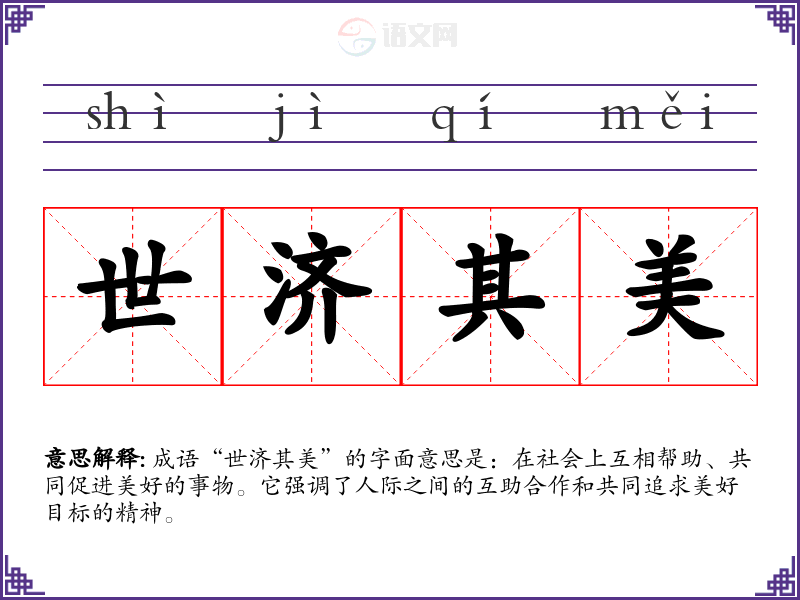 成语“世济其美”的字面意思是:在社会上互相帮助、共同促进美好的事物。它强调了人际之间的互助合作和共同追求美好目标的精神。