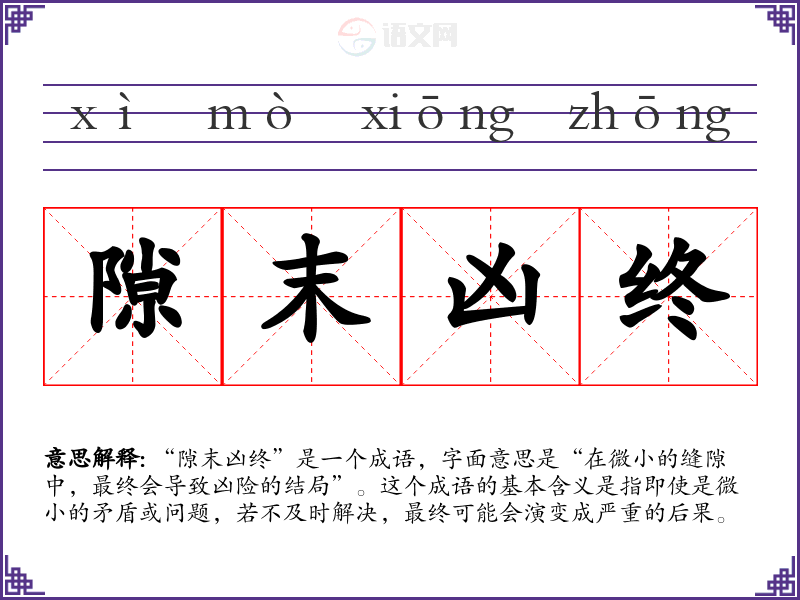 “隙末凶终”并不是一个广为人知的成语,可能是对一些古代典籍中描述潜在危机的表达的概括。一般来说,这类成语来源于历史故事或文学作品,强调小问题如果不处理,可能会演变成大麻烦。