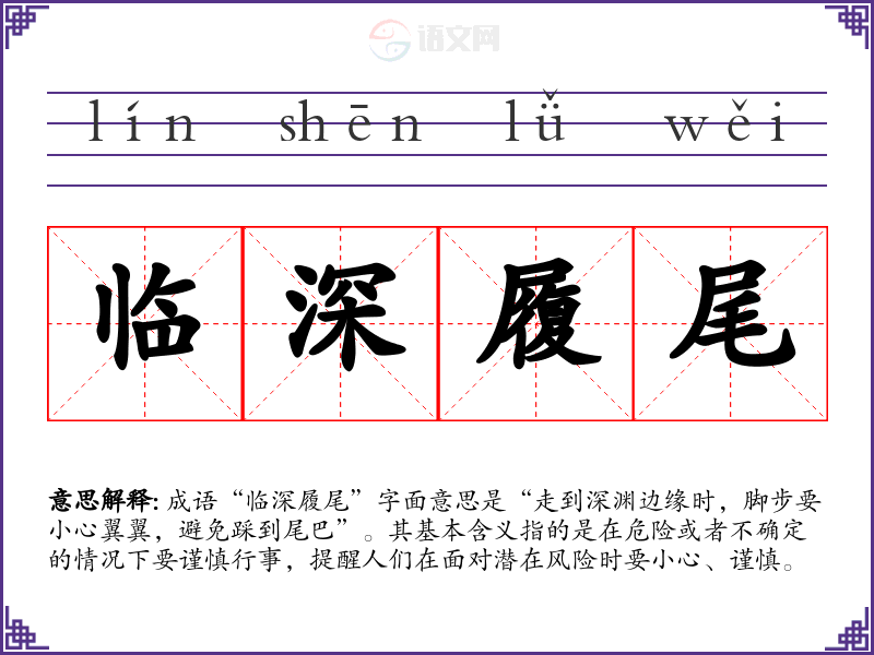 成语“临深履尾”字面意思是“走到深渊边缘时,脚步要小心翼翼,避免踩到尾巴”。其基本含义指的是在危险或者不确定的情况下要谨慎行事,提醒人们在面对潜在风险时要小心、谨慎。