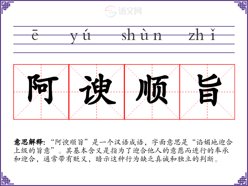 “阿谀顺旨”是一个汉语成语,字面意思是“谄媚地迎合上级的旨意”。其基本含义是指为了迎合他人的意愿而进行的奉承和迎合,通常带有贬义,暗示这种行为缺乏真诚和独立的判断。