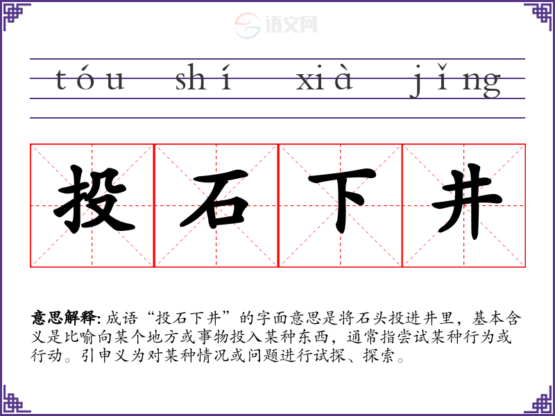 成语“投石下井”的字面意思是将石头投进井里,基本含义是比喻向某个地方或事物投入某种东西,通常指尝试某种行为或行动。引申义为对某种情况或问题进行试探、探索。