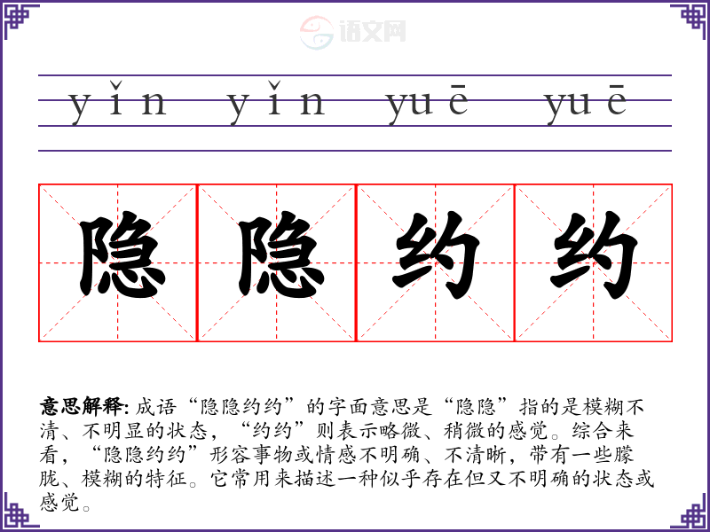 成语“隐隐约约”的字面意思是“隐隐”指的是模糊不清、不明显的状态,“约约”则表示略微、稍微的感觉。综合来看,“隐隐约约”形容事物或情感不明确、不清晰,带有一些朦胧、模糊的特征。它常用来描述一种似乎存在但又不明确的状态或感觉。