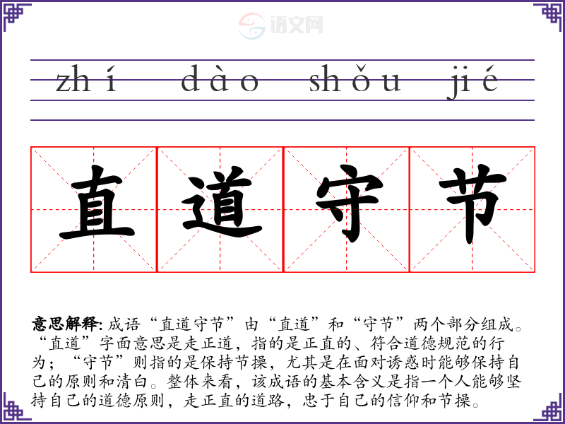 成语“直道守节”由“直道”和“守节”两个部分组成。“直道”字面意思是走正道,指的是正直的、符合道德规范的行为;“守节”则指的是保持节操,尤其是在面对诱惑时能够保持自己的原则和清白。整体来看,该成语的基本含义是指一个人能够坚持自己的道德原则,走正直的道路,忠于自己的信仰和节操。