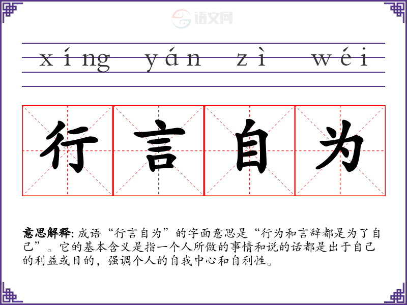 成语“行言自为”的字面意思是“行为和言辞都是为了自己”。它的基本含义是指一个人所做的事情和说的话都是出于自己的利益或目的,强调个人的自我中心和自利性。
