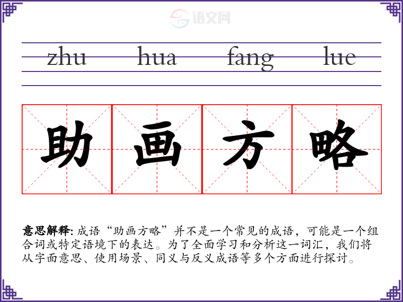 成语“助画方略”并不是一个常见的成语,可能是一个组合词或特定语境下的表达。为了全面学习和分析这一词汇,我们将从字面意思、使用场景、同义与反义成语等多个方面进行探讨。
