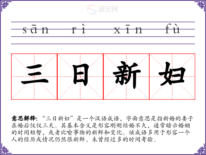 “三日新妇”是一个汉语成语,字面意思是指新婚的妻子在婚后仅仅三天。其基本含义是形容刚刚结婚不久,通常暗示婚姻的时间短暂,或者比喻事物的新鲜和变化。该成语多用于形容一个人的经历或情况仍然很新鲜、未曾经过多的时间考验。