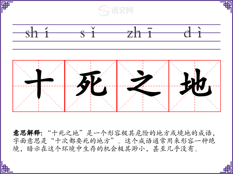 “十死之地”是一个形容极其危险的地方或境地的成语,字面意思是“十次都要死的地方”。这个成语通常用来形容一种绝境,暗示在这个环境中生存的机会极其渺小,甚至几乎没有。