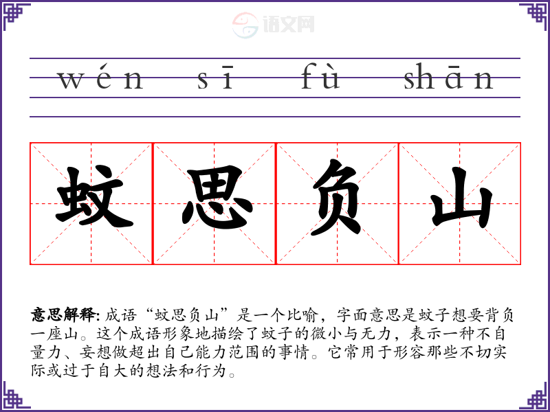 “蚊思负山”的来源并不明确,但可以推测其出现在古代文人的诗词或寓言中,用来警示人们要量力而行,避免高估自己的能力。成语的构成也反映了传统文化中对谦虚和实际的推崇。