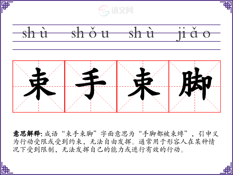 成语“束手束脚”字面意思为“手脚都被束缚”,引申义为行动受限或受到约束,无法自由发挥。通常用于形容人在某种情况下受到限制,无法发挥自己的能力或进行有效的行动。