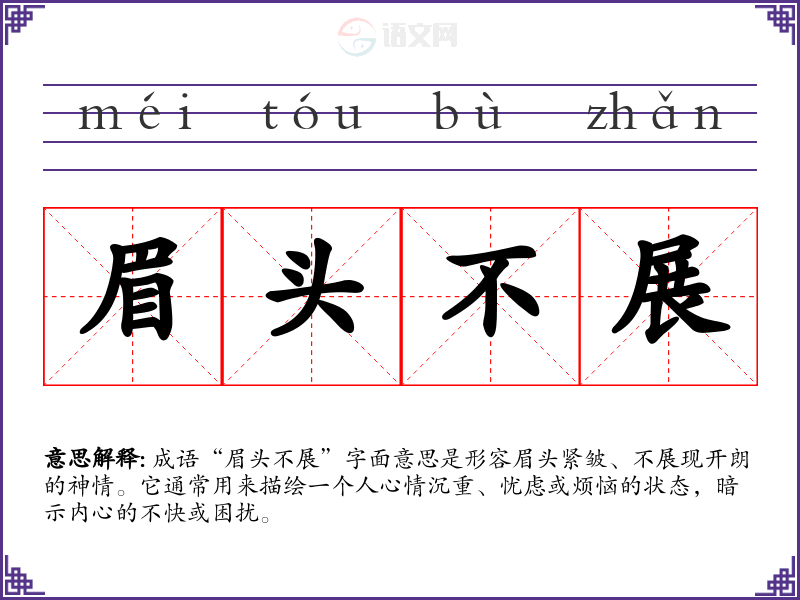 - 眉开眼笑:形容开心的样子,与“眉头不展”形成鲜明对比,代表愉快的情绪。
