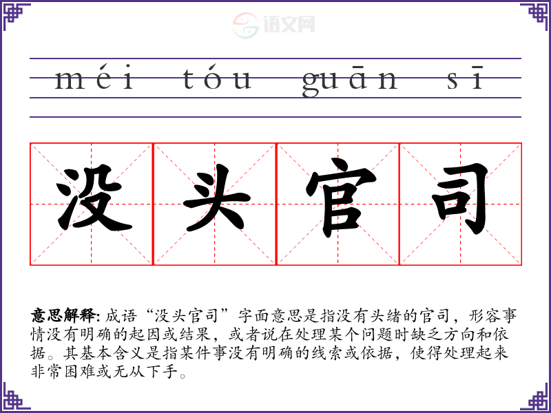 成语“没头官司”字面意思是指没有头绪的官司,形容事情没有明确的起因或结果,或者说在处理某个问题时缺乏方向和依据。其基本含义是指某件事没有明确的线索或依据,使得处理起来非常困难或无从下手。