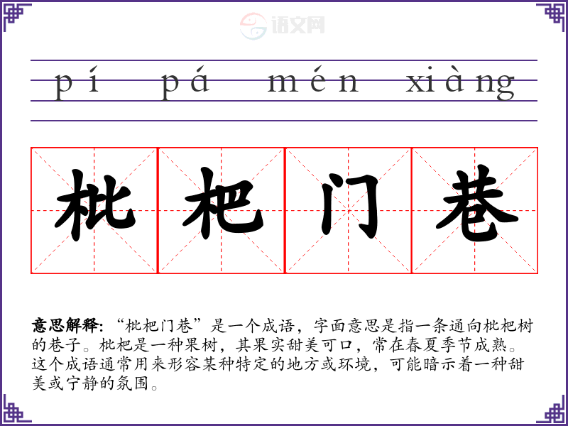 “枇杷门巷”是一个成语,字面意思是指一条通向枇杷树的巷子。枇杷是一种果树,其果实甜美可口,常在春夏季节成熟。这个成语通常用来形容某种特定的地方或环境,可能暗示着一种甜美或宁静的氛围。