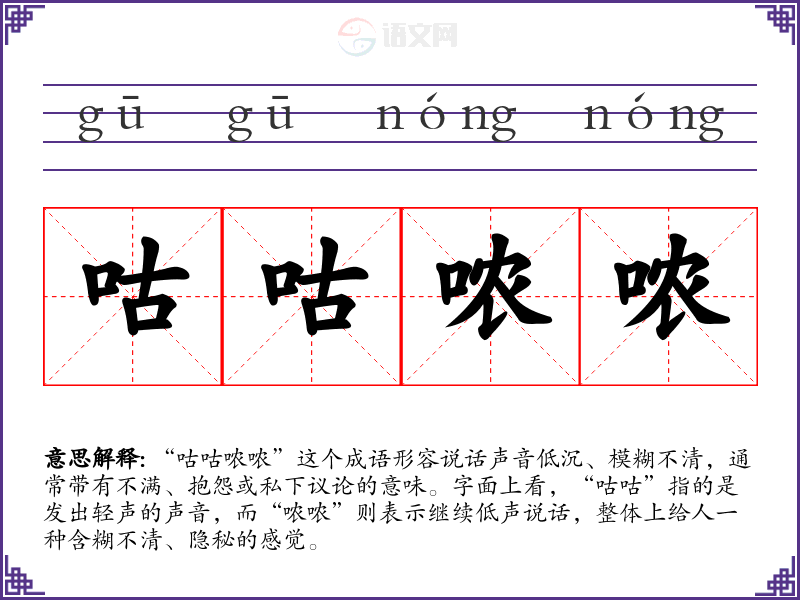 “咕咕哝哝”这个成语形容说话声音低沉、模糊不清,通常带有不满、抱怨或私下议论的意味。字面上看,“咕咕”指的是发出轻声的声音,而“哝哝”则表示继续低声说话,整体上给人一种含糊不清、隐秘的感觉。