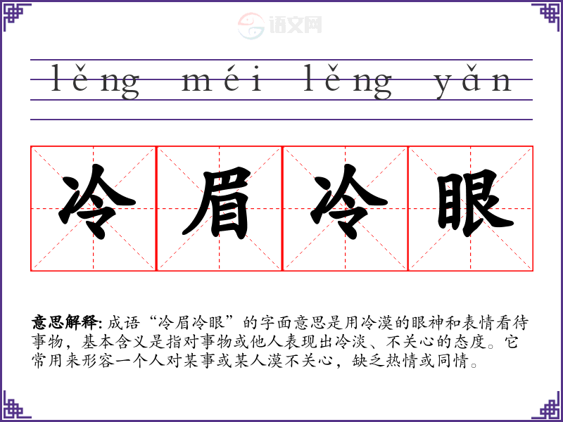 成语“冷眉冷眼”的字面意思是用冷漠的眼神和表情看待事物,基本含义是指对事物或他人表现出冷淡、不关心的态度。它常用来形容一个人对某事或某人漠不关心,缺乏热情或同情。