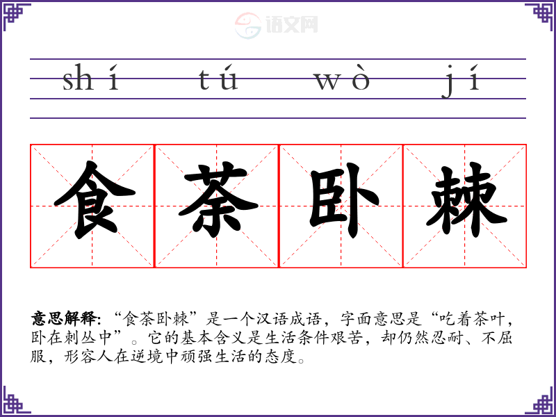 “食荼卧棘”是一个汉语成语,字面意思是“吃着茶叶,卧在刺丛中”。它的基本含义是生活条件艰苦,却仍然忍耐、不屈服,形容人在逆境中顽强生活的态度。