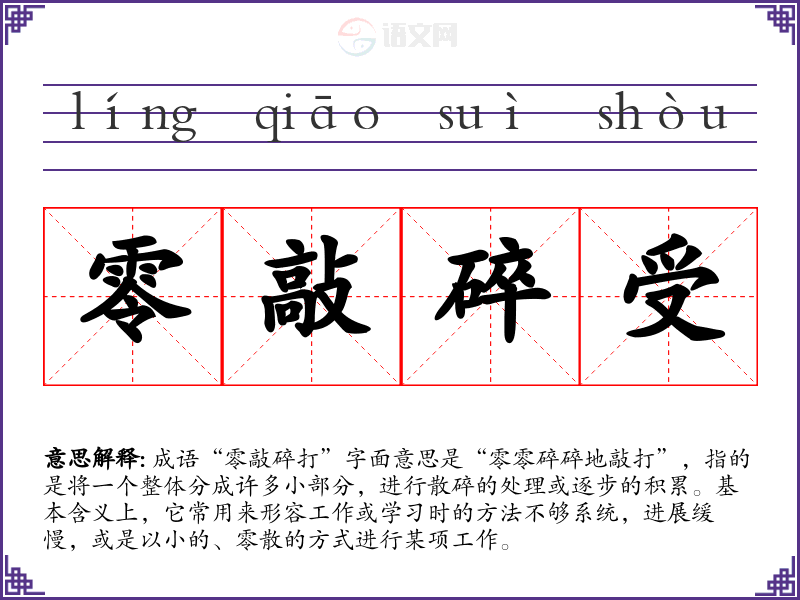 成语“零敲碎打”字面意思是“零零碎碎地敲打”,指的是将一个整体分成许多小部分,进行散碎的处理或逐步的积累。基本含义上,它常用来形容工作或学习时的方法不够系统,进展缓慢,或是以小的、零散的方式进行某项工作。