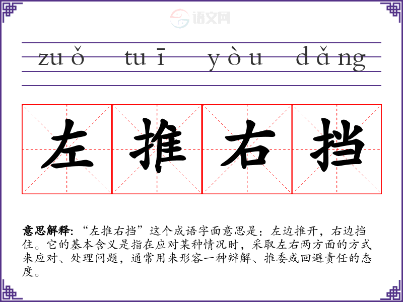 “左推右挡”这个成语字面意思是:左边推开,右边挡住。它的基本含义是指在应对某种情况时,采取左右两方面的方式来应对、处理问题,通常用来形容一种辩解、推委或回避责任的态度。