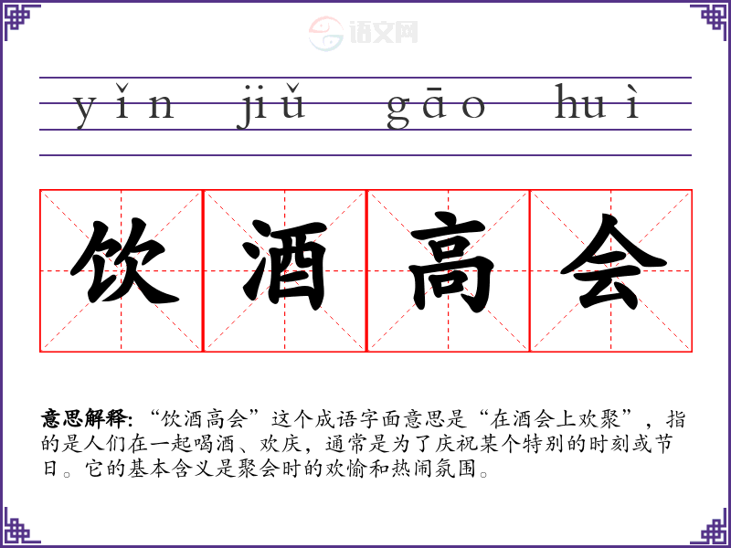 “饮酒高会”这个成语字面意思是“在酒会上欢聚”,指的是人们在一起喝酒、欢庆,通常是为了庆祝某个特别的时刻或节日。它的基本含义是聚会时的欢愉和热闹氛围。