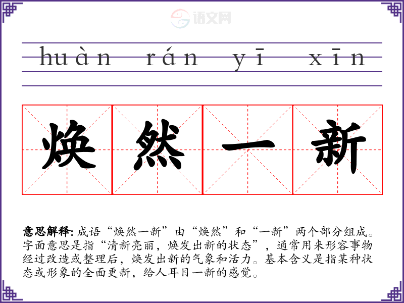 成语“焕然一新”由“焕然”和“一新”两个部分组成。字面意思是指“清新亮丽,焕发出新的状态”,通常用来形容事物经过改造或整理后,焕发出新的气象和活力。基本含义是指某种状态或形象的全面更新,给人耳目一新的感觉。