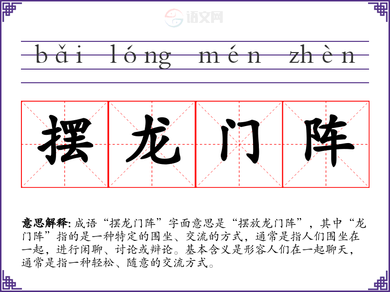 成语“摆龙门阵”字面意思是“摆放龙门阵”,其中“龙门阵”指的是一种特定的围坐、交流的方式,通常是指人们围坐在一起,进行闲聊、讨论或辩论。基本含义是形容人们在一起聊天,通常是指一种轻松、随意的交流方式。