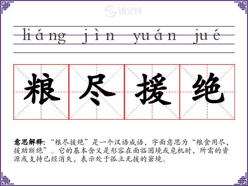 “粮尽援绝”是一个汉语成语,字面意思为“粮食用尽,援助断绝”。它的基本含义是形容在面临困境或危机时,所需的资源或支持已经消失,表示处于孤立无援的窘境。