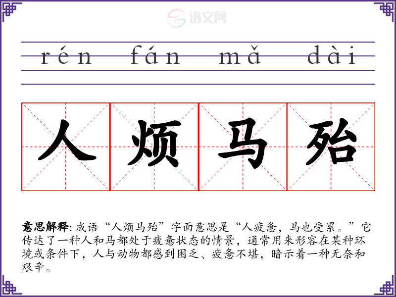 - 反义成语:轻松自在、游刃有余。与“人烦马殆”相对,这些成语描述的是一种轻松愉快、毫无压力的状态。