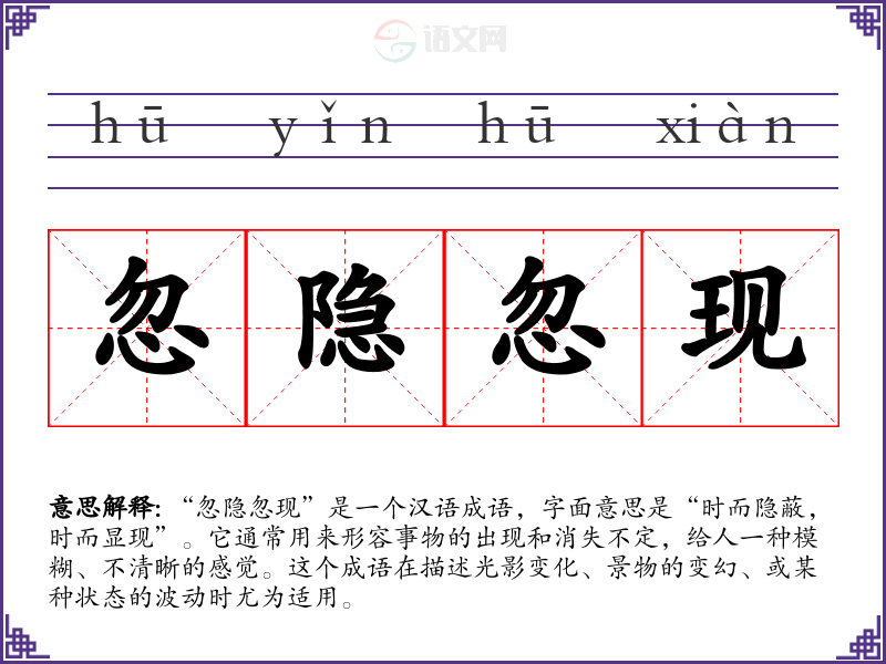 “忽隐忽现”是一个汉语成语,字面意思是“时而隐蔽,时而显现”。它通常用来形容事物的出现和消失不定,给人一种模糊、不清晰的感觉。这个成语在描述光影变化、景物的变幻、或某种状态的波动时尤为适用。