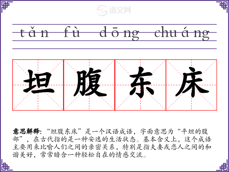 “坦腹东床”是一个汉语成语,字面意思为“平坦的腹部”,在古代指的是一种安逸的生活状态。基本含义上,这个成语主要用来比喻人们之间的亲密关系,特别是指夫妻或恋人之间的和谐美好,常常暗含一种轻松自在的情感交流。