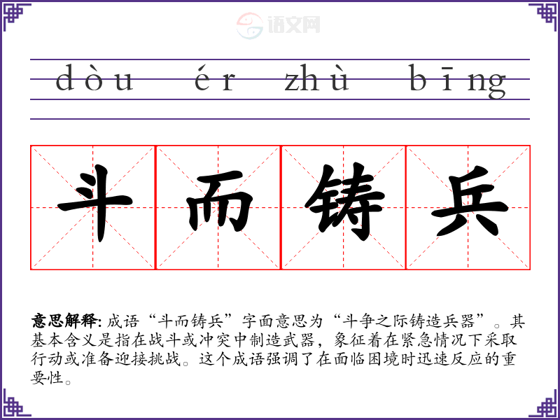成语“斗而铸兵”字面意思为“斗争之际铸造兵器”。其基本含义是指在战斗或冲突中制造武器,象征着在紧急情况下采取行动或准备迎接挑战。这个成语强调了在面临困境时迅速反应的重要性。