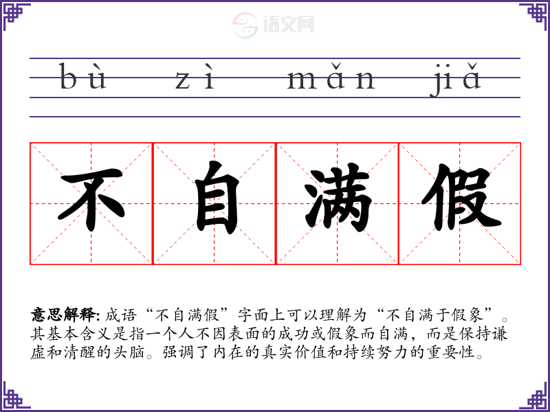 成语“不自满假”字面上可以理解为“不自满于假象”。其基本含义是指一个人不因表面的成功或假象而自满,而是保持谦虚和清醒的头脑。强调了内在的真实价值和持续努力的重要性。