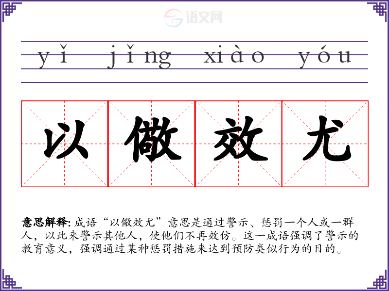 成语“以儆效尤”意思是通过警示、惩罚一个人或一群人,以此来警示其他人,使他们不再效仿。这一成语强调了警示的教育意义,强调通过某种惩罚措施来达到预防类似行为的目的。