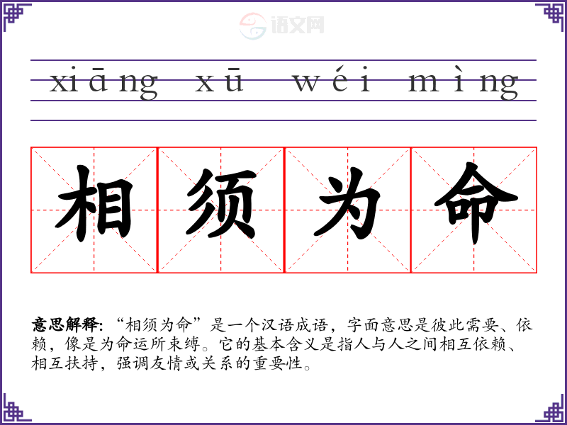 “相须为命”是一个汉语成语,字面意思是彼此需要、依赖,像是为命运所束缚。它的基本含义是指人与人之间相互依赖、相互扶持,强调友情或关系的重要性。
