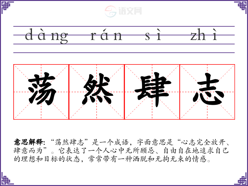“荡然肆志”并不是一个广泛流传的成语,可能是对一些成语的组合而来。成语“荡然”通常用来形容事物消失得干干净净,而“肆志”则可以理解为肆意追求自己的志向。虽然没有明确的历史典故,但从字面构成来看,传达了对追求自由和理想的向往。