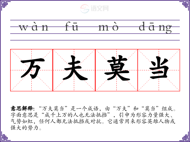 “万夫莫当”是一个成语,由“万夫”和“莫当”组成。字面意思是“成千上万的人也无法抵挡”,引申为形容力量强大、气势如虹,任何人都无法抵挡或对抗。它通常用来形容英雄人物或强大的势力。