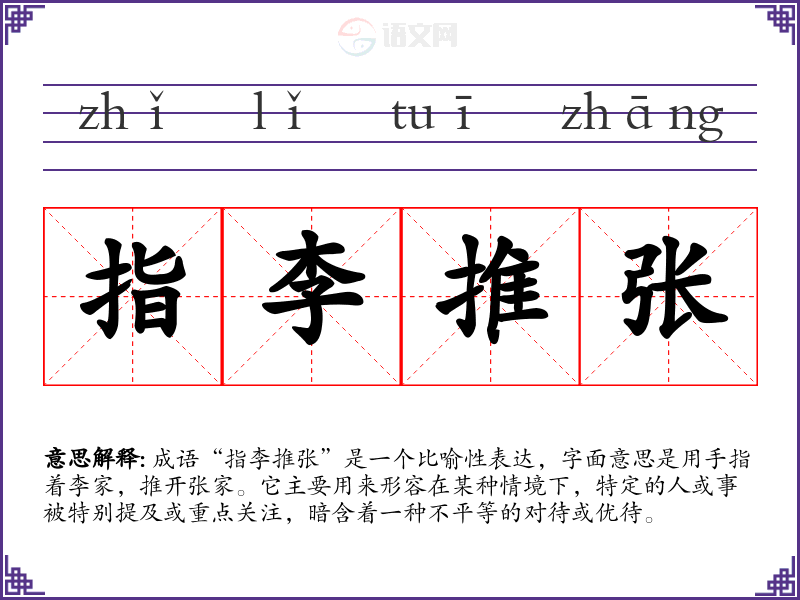 成语“指李推张”是一个比喻性表达,字面意思是用手指着李家,推开张家。它主要用来形容在某种情境下,特定的人或事被特别提及或重点关注,暗含着一种不平等的对待或优待。