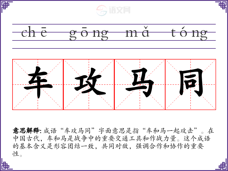 成语“车攻马同”字面意思是指“车和马一起攻击”。在**古代,车和马是战争中的重要交通工具和作战力量。这个成语的基本含义是形容团结一致,共同对敌,强调合作和协作的重要性。