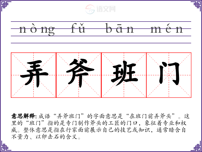 成语“弄斧班门”的字面意思是“在班门前弄斧头”。这里的“班门”指的是专门制作斧头的工匠的门口,象征着专业和权威。整体意思是指在行家面前展示自己的技艺或知识,通常暗含自不量力、以卵击石的含义。