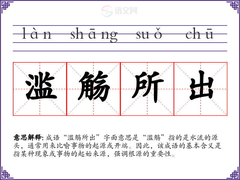 成语“滥觞所出”字面意思是“滥觞”指的是水流的源头,通常用来比喻事物的起源或开端。因此,该成语的基本含义是指某种现象或事物的起始来源,强调根源的重要性。