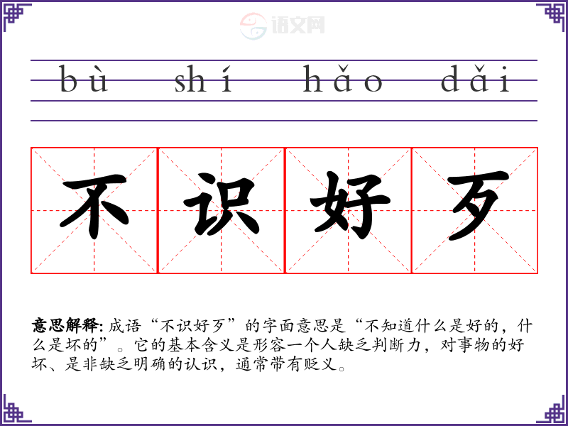 成语“不识好歹”的字面意思是“不知道什么是好的,什么是坏的”。它的基本含义是形容一个人缺乏判断力,对事物的好坏、是非缺乏明确的认识,通常带有贬义。