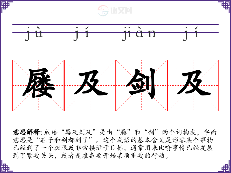 成语“屦及剑及”是由“屦”和“剑”两个词构成,字面意思是“鞋子和剑都到了”。这个成语的基本含义是形容某个事物已经到了一个极限或非常接近于目标,通常用来比喻事情已经发展到了紧要关头,或者是准备要开始某项重要的行动。