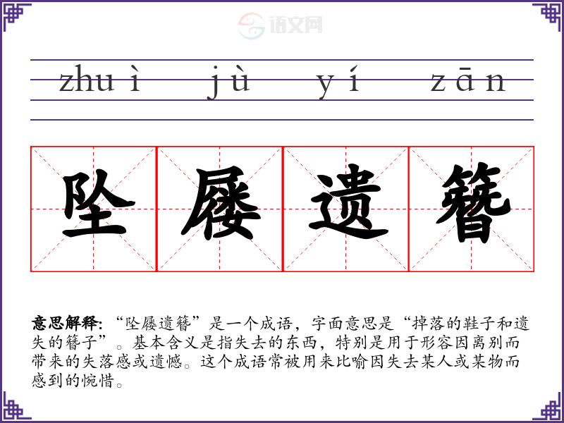 “坠屦遗簪”是一个成语,字面意思是“掉落的鞋子和遗失的簪子”。基本含义是指失去的东西,特别是用于形容因离别而带来的失落感或遗憾。这个成语常被用来比喻因失去某人或某物而感到的惋惜。