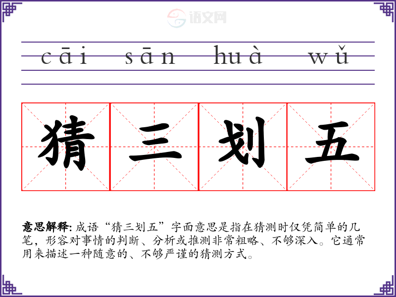成语“猜三划五”字面意思是指在猜测时仅凭简单的几笔,形容对事情的判断、分析或推测非常粗略、不够深入。它通常用来描述一种随意的、不够严谨的猜测方式。