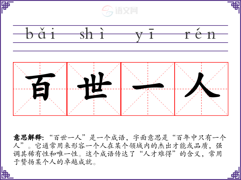 “百世一人”是一个成语,字面意思是“百年中只有一个人”。它通常用来形容一个人在某个领域内的杰出才能或品质,强调其稀有性和唯一性。这个成语传达了“人才难得”的含义,常用于赞扬某个人的卓越成就。