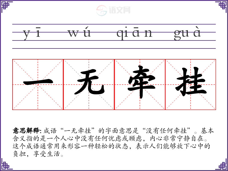 成语“一无牵挂”的字面意思是“没有任何牵挂”。基本含义指的是一个人心中没有任何忧虑或顾虑,内心非常宁静自在。这个成语通常用来形容一种轻松的状态,表示人们能够放下心中的负担,享受生活。