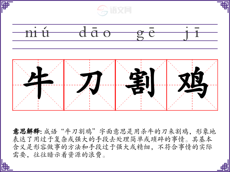 成语“牛刀割鸡”字面意思是用杀牛的刀来割鸡,形象地表达了用过于复杂或强大的手段去处理简单或琐碎的事情。其基本含义是形容做事的方法和手段过于强大或精细,不符合事情的实际需要,往往暗示着资源的浪费。