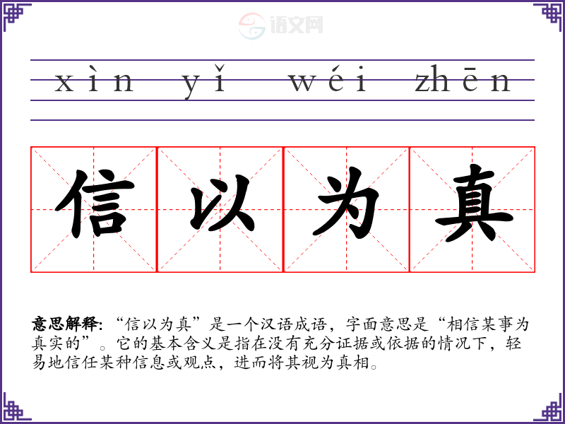 “信以为真”是一个汉语成语,字面意思是“相信某事为真实的”。它的基本含义是指在没有充分证据或依据的情况下,轻易地信任某种信息或观点,进而将其视为真相。