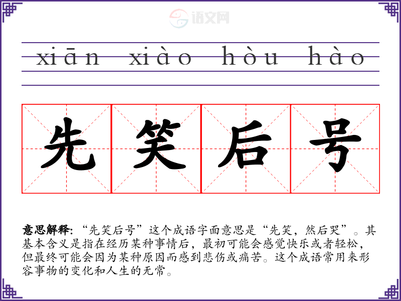 “先笑后号”这个成语字面意思是“先笑,然后哭”。其基本含义是指在经历某种事情后,最初可能会感觉快乐或者轻松,但最终可能会因为某种原因而感到悲伤或痛苦。这个成语常用来形容事物的变化和人生的无常。