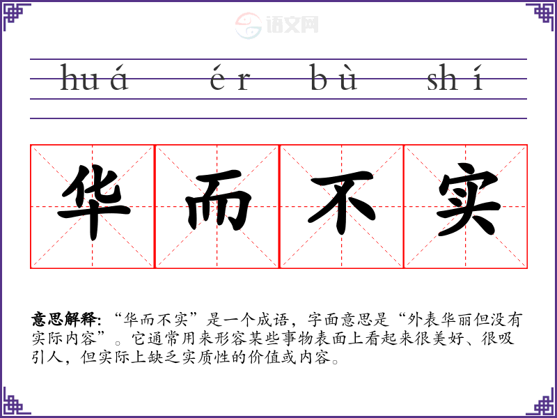 “华而不实”是一个成语,字面意思是“外表华丽但没有实际内容”。它通常用来形容某些事物表面上看起来很美好、很吸引人,但实际上缺乏实质性的价值或内容。