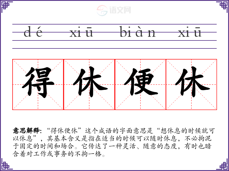 “得休便休”这个成语的字面意思是“想休息的时候就可以休息”,其基本含义是指在适当的时候可以随时休息,不必拘泥于固定的时间和场合。它传达了一种灵活、随意的态度,有时也暗含着对工作或事务的不拘一格。