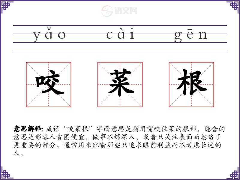 成语“咬菜根”字面意思是指用嘴咬住菜的根部,隐含的意思是形容人贪图便宜,做事不够深入,或者只关注表面而忽略了更重要的部分。通常用来比喻那些只追求眼前利益而不考虑长远的人。